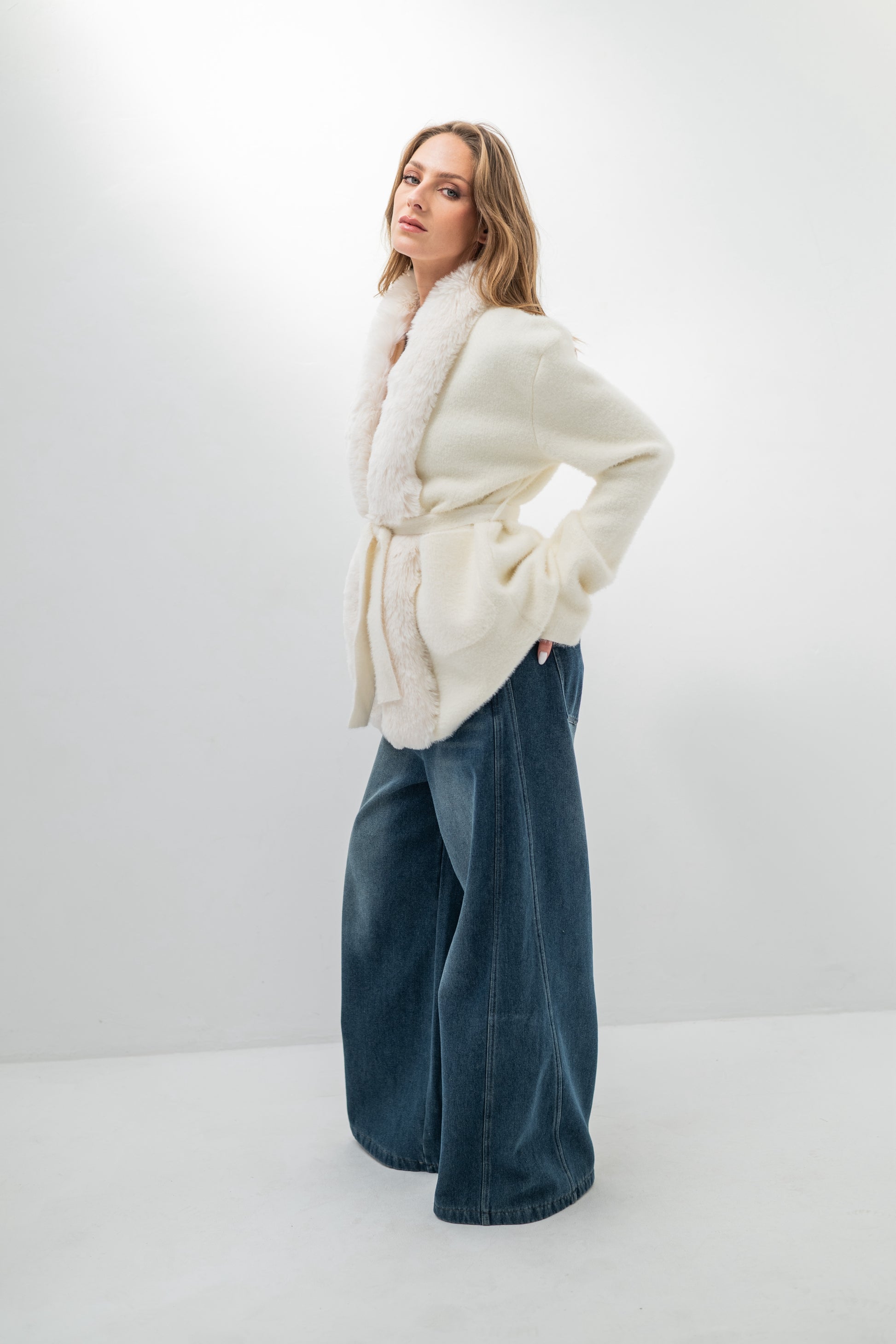 Cette version unie de la veste LEONA incarne la douceur et la pureté. Tricotée dans une maille texturée, elle se distingue par un large col et une bordure en fausse fourrure ultra-douce qui habillent la silhouette avec élégance. Sa ceinture à nouer vient souligner la taille tout en offrant un confort cocooning. Une pièce raffinée et intemporelle, idéale pour les journées d’hiver ou les soirées douces d’automne.