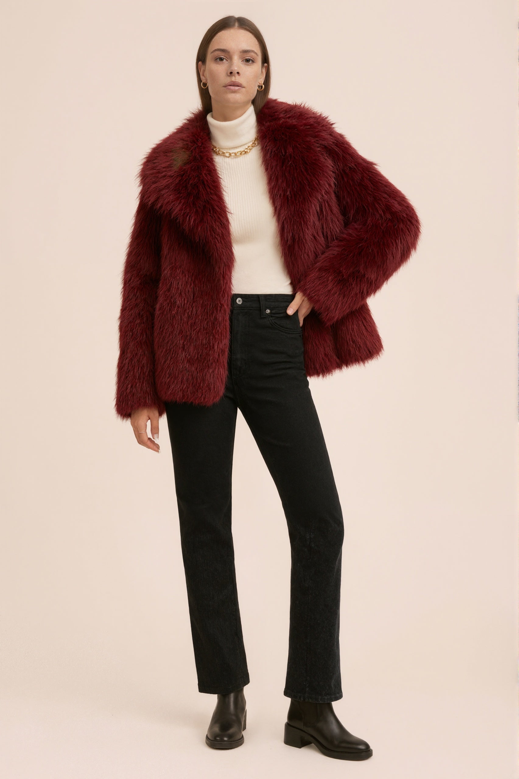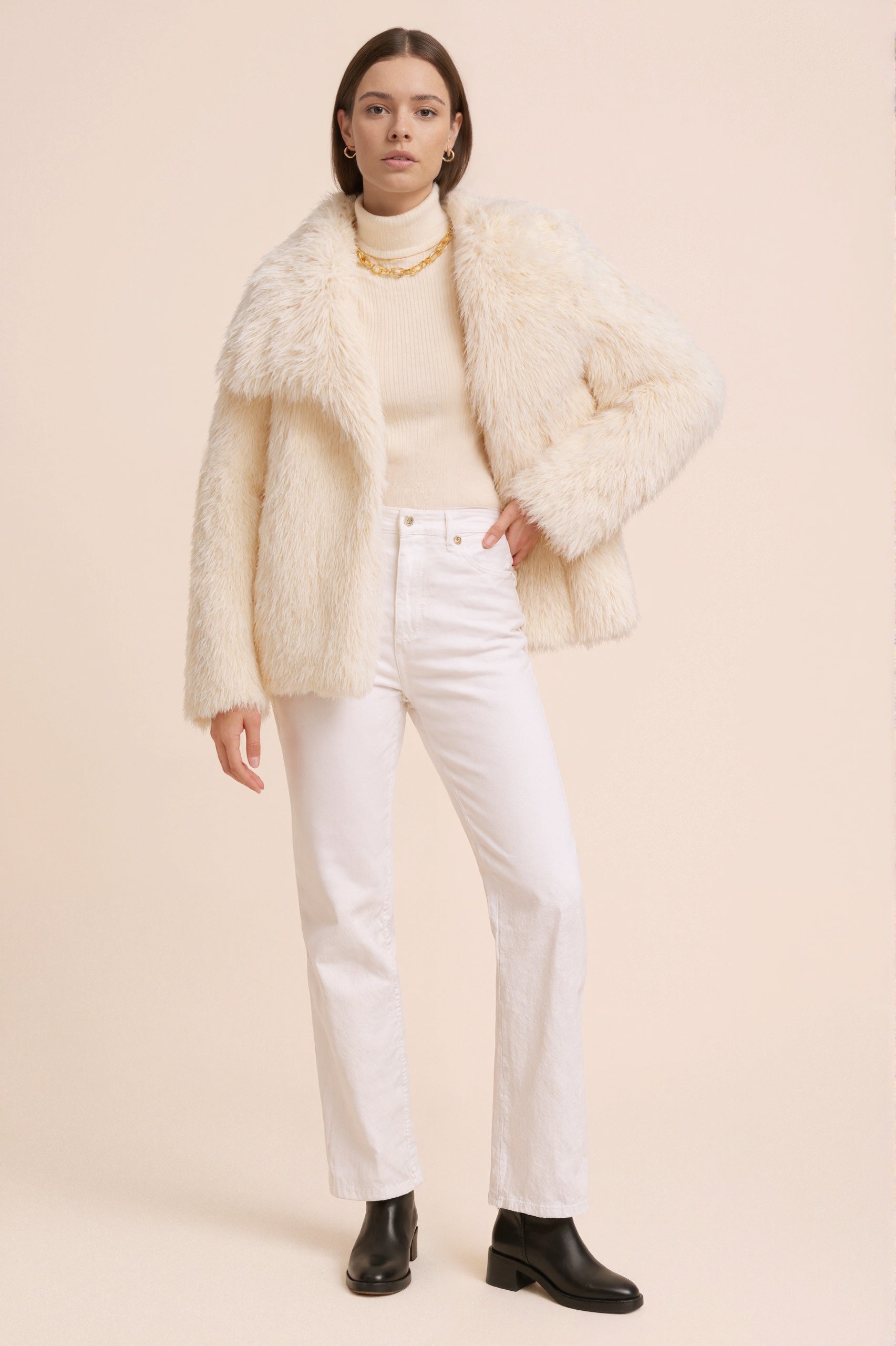 MONROE incarne l’allure confidentielle et élégante des rues parisiennes. Cette veste courte en fausse fourrure luxueuse vous enveloppe d’un confort raffiné tout en affirmant une silhouette féminine et assumée. Portée avec un denim ajusté, des lunettes noires et un sac structuré, elle révèle un look urbain, doux et audacieux, parfait pour les jours frais.