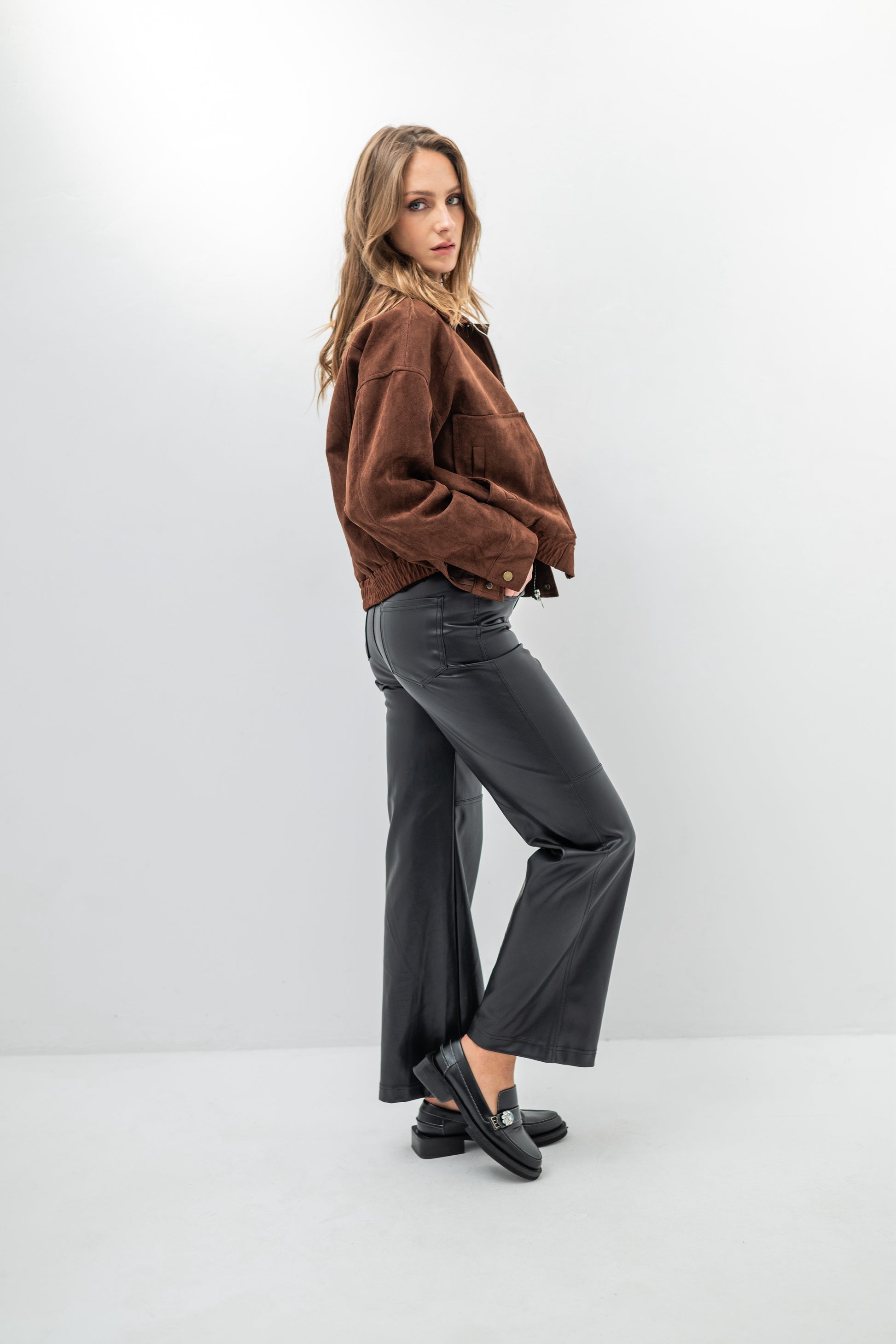 La veste SIENNA revisite le blouson court avec une touche de douceur et d’élégance. Confectionnée dans une suédine effet daim au toucher velouté, elle séduit par sa coupe légèrement oversize et ses poches plaquées qui lui confèrent un esprit casual chic. Les boutons-pression dorés et la fermeture zippée apportent une note moderne et raffinée. Facile à porter sur un col roulé, un jean ou un pantalon en simili, elle devient un essentiel automne-hiver alliant confort et style.